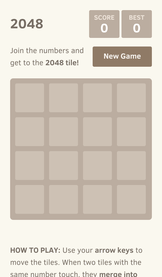 새 게임게임 방법: 화살표 키를 사용하여 타일을 움직이세요. 같은 숫자의 타일이 만나면 하나로 합쳐집니다!